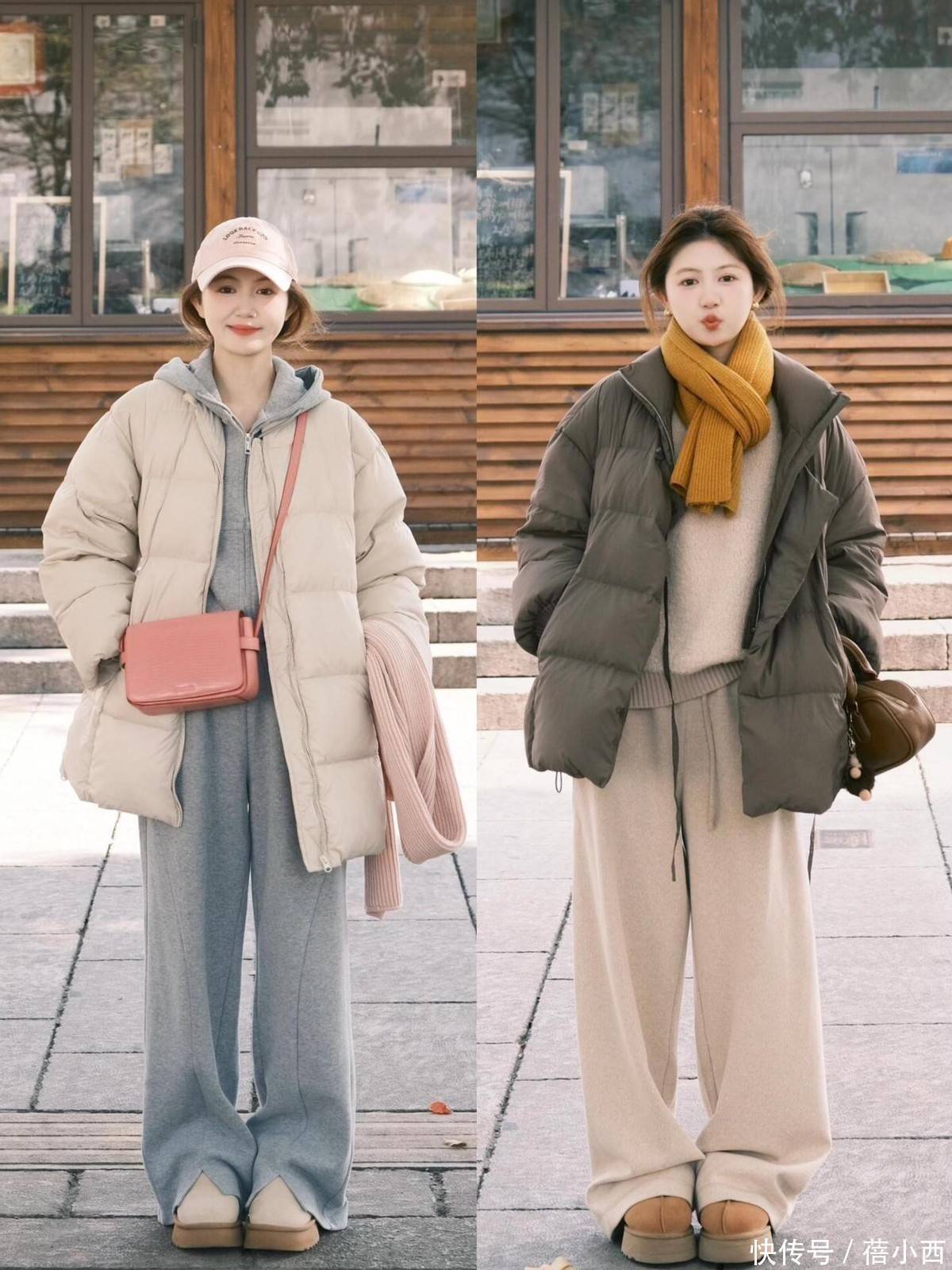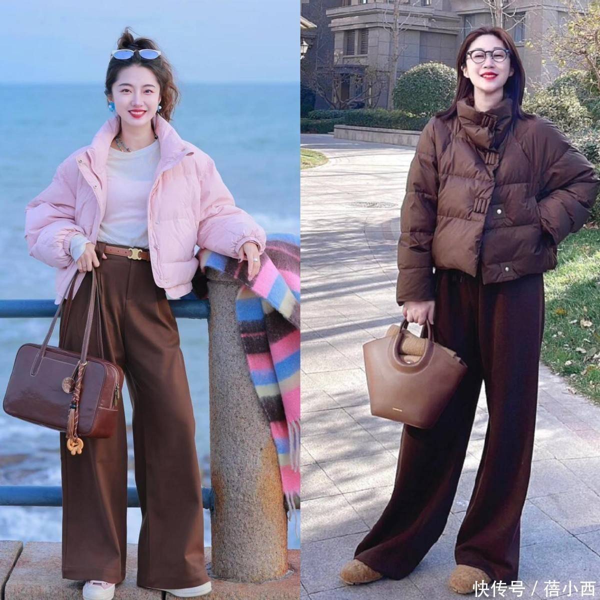 面包羽绒服的蓬松感和阔腿裤的宽松感看似难兼容,实则惟有收拢“一收一垂”的手段就能破解。
