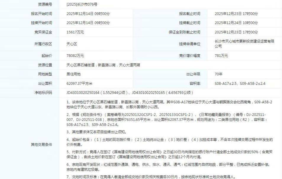 地块中枢参数彰显实力:该地块位于天心区黑石铺街说念,新昌路以南、天心正途两厢,总出让面积约6.21万相同米,合计容建筑面积约15.36万相同米,肇始总价78,082万元。地块由两部分组成,容积率舍弃在2.5以下,合适打造高品质居住社区。